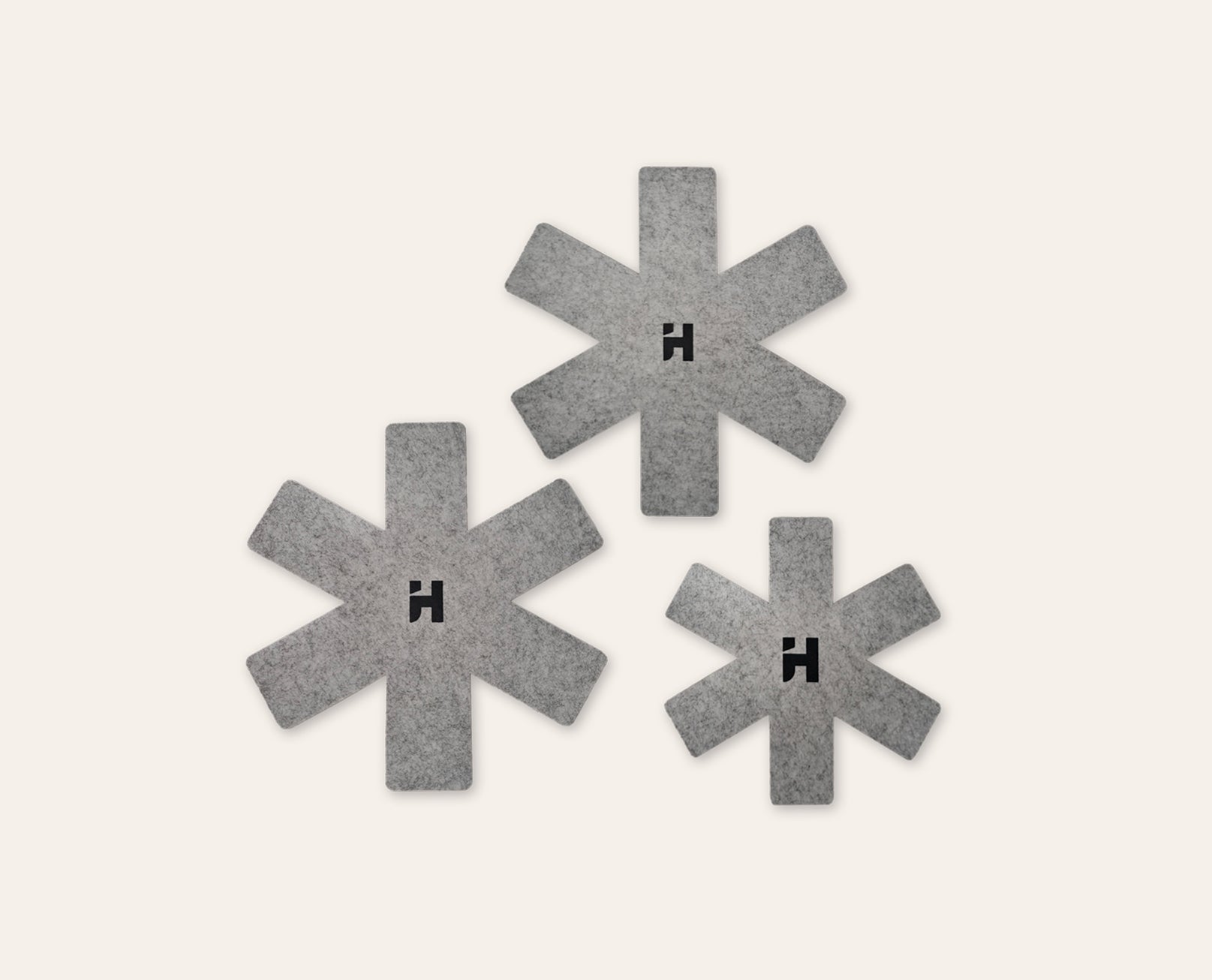 Aizsargā gan pannas, gan virsmas! Šie mīkstie, neslīdošie filca aizsargi droši aizsargā pannas un katlus no skrāpējumiem, kad tie ir sakrauti viens virs otra. Var izmantot arī kā paliktņus karstajiem ēdieniem – pasargāsiet darba virsmas vai galdu no karstuma plankumiem.